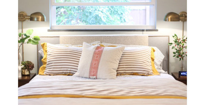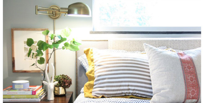 In my opinion, the best thing you can do for your bedroom in the fall is make sure you have adequate lighting. It will help lift your mood when the sun starts setting earlier and rising later. Try flanking the bed with table lamps or sconces to keep things bright.